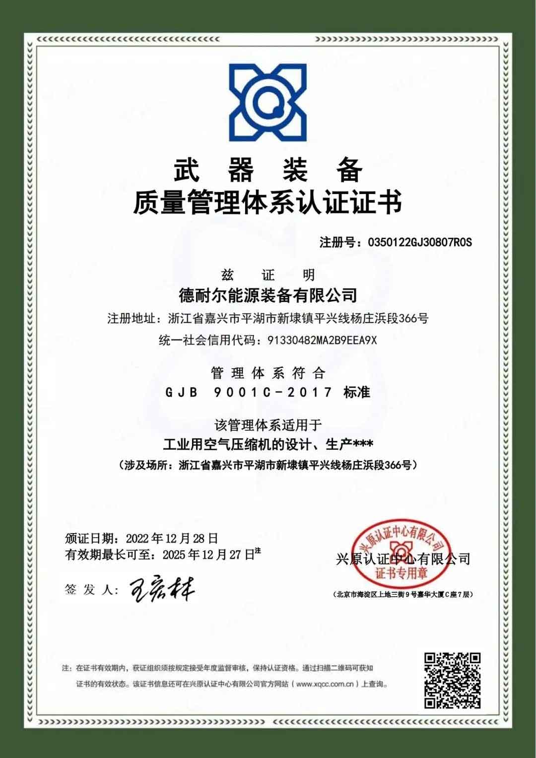 12月28日,德耐爾能源裝備有限公司獲得《GJB9001C-2017武器裝備質(zhì)量管理體系認證證書》,質(zhì)量管理體系認證所覆蓋范圍為:工業(yè)用空氣壓縮機的設(shè)計、生產(chǎn);質(zhì)量管理體系認證的通過意味德耐爾能源裝備有限公司在軍品產(chǎn)業(yè)的質(zhì)量管理能力和水平達到了新版國軍標質(zhì)量管理體系的要求,也使得公司成為行業(yè)內(nèi)通過國軍標質(zhì)量管理體系認證的少數(shù)幾家單位之一,對進一步提升產(chǎn)品質(zhì)量管理水平、提升生產(chǎn)服務(wù)能力、開拓軍品市場、滿足軍方對武器裝備的質(zhì)量要求具有重要意義。