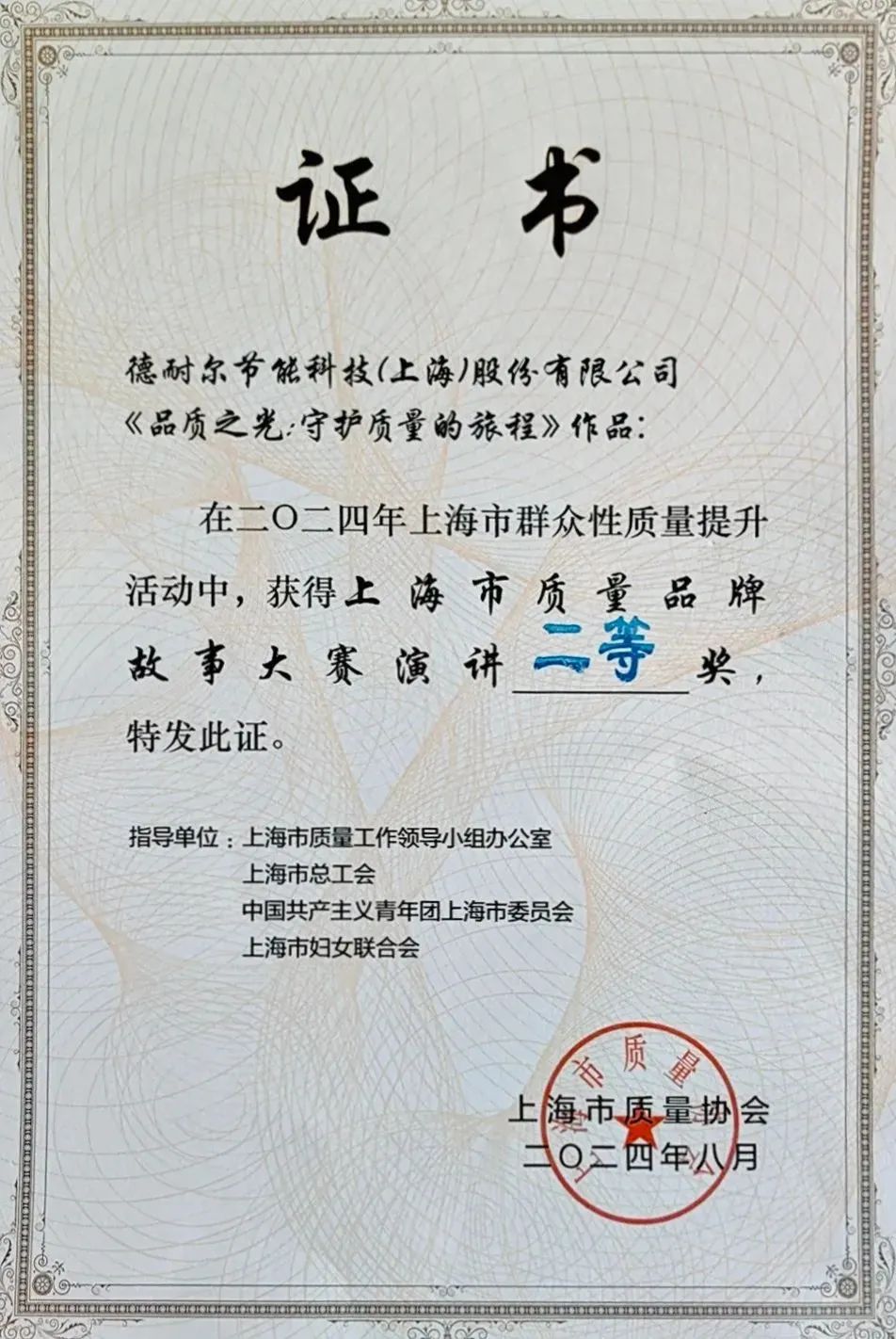 2024年上海市質(zhì)量品牌故事大賽以“上海質(zhì)量新優(yōu)勢(shì),中國(guó)品牌新風(fēng)采”為主題,旨在宣傳展示各行各業(yè)質(zhì)量品牌建設(shè)最新成果及發(fā)揮品牌引領(lǐng)作用的經(jīng)驗(yàn)和故事,傳播品牌文化。德耐爾積極報(bào)名參與,成功在復(fù)賽中沖出重圍,有幸進(jìn)入決賽。通過(guò)九人專家評(píng)審團(tuán)現(xiàn)場(chǎng)評(píng)審,最終榮獲演講比賽二等獎(jiǎng)。