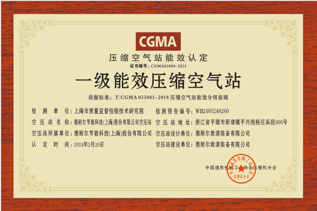 德耐爾節(jié)能科技(上海)股份有限公司榮獲行業(yè)領(lǐng)先的一級能效壓縮空氣站認(rèn)證!這是對我們不懈努力和持續(xù)創(chuàng)新的極高認(rèn)可,標(biāo)志著德耐爾在節(jié)能減排和高效能源管理領(lǐng)域再次取得里程碑成就。 "一級能效壓縮空氣站"指的是在