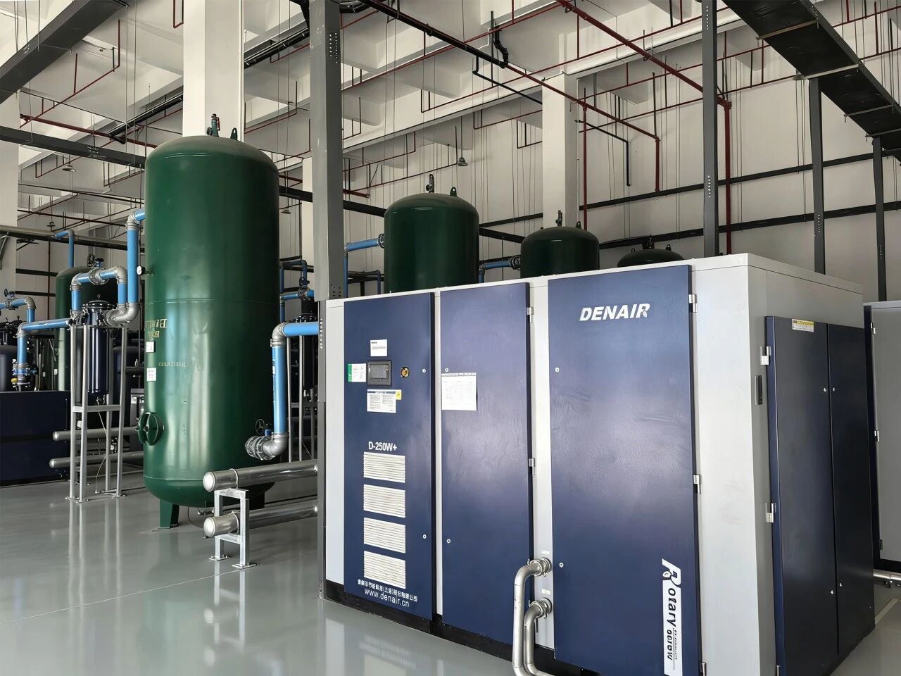 走進(jìn)站房,首先映入眼簾的是余熱回收系統(tǒng),其后銜接保溫水箱及電壓補(bǔ)水裝置,形成高效的余熱循環(huán)利用體系,最大化提升能源利用率。緊鄰余熱回收系統(tǒng)的是核心動(dòng)力設(shè)備——德耐爾雙級(jí)壓縮DAV-250W+節(jié)能螺桿式空壓機(jī),作為壓縮空氣系統(tǒng)的“動(dòng)力心臟”,依托雙級(jí)壓縮技術(shù)實(shí)現(xiàn)比單級(jí)壓縮機(jī)型節(jié)能18%,年均可減少能耗30%,同時(shí)以±0.02MPa的壓力穩(wěn)定輸出,為后續(xù)供氣鏈路筑牢可靠根基。