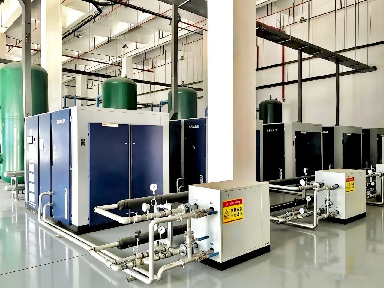 此外,系統(tǒng)還配套設(shè)置空壓機(jī)后處理相關(guān)設(shè)備及氮?dú)夤に嚬薜容o助設(shè)施,與壓縮空氣系統(tǒng)、高純氮?dú)庀到y(tǒng)、余熱回收系統(tǒng)及純水、真空系統(tǒng)協(xié)同聯(lián)動(dòng),加之全鋁鎂合金節(jié)能管道的全域鋪設(shè),形成一套集成化、節(jié)能化、高適配性的動(dòng)輔站房解決方案。整套系統(tǒng)以精準(zhǔn)的工藝設(shè)計(jì)、優(yōu)質(zhì)的節(jié)能設(shè)備及科學(xué)的布局規(guī)劃,為國(guó)企鋰電生產(chǎn)提供安全、穩(wěn)定、高效的動(dòng)輔保障,助力企業(yè)實(shí)現(xiàn)綠色低碳生產(chǎn)與高質(zhì)量發(fā)展。