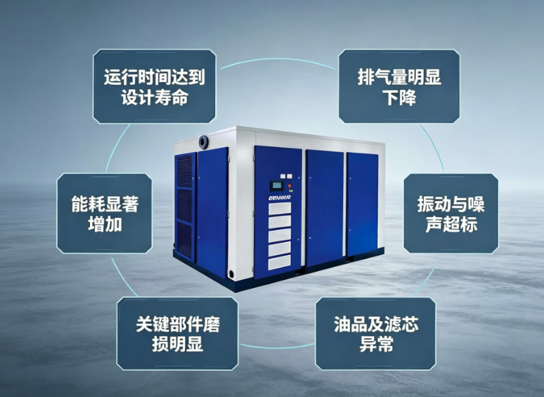螺桿空壓機(jī)作為連續(xù)運(yùn)行的工業(yè)設(shè)備,經(jīng)過長期運(yùn)轉(zhuǎn)后,主機(jī)內(nèi)部零件必然出現(xiàn)磨損。明確大修標(biāo)準(zhǔn),既能避免過度維修,也能防止突發(fā)故障導(dǎo)致停產(chǎn)。通常,當(dāng)設(shè)備滿足以下任一條件時(shí),就應(yīng)安排大修。