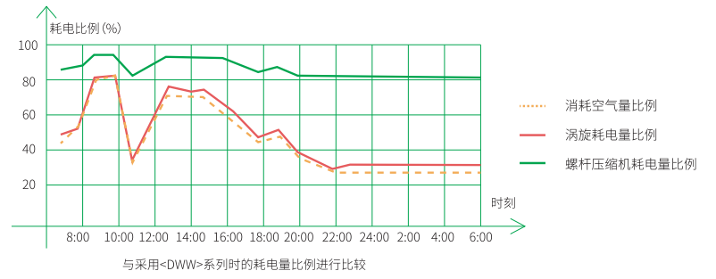 消耗空氣量發(fā)生變化時(shí),會(huì)因壓縮機(jī)控制方式的不同而產(chǎn)生較大的誤差。可將耗電量一直在較低限度,從而提升節(jié)能效果。
