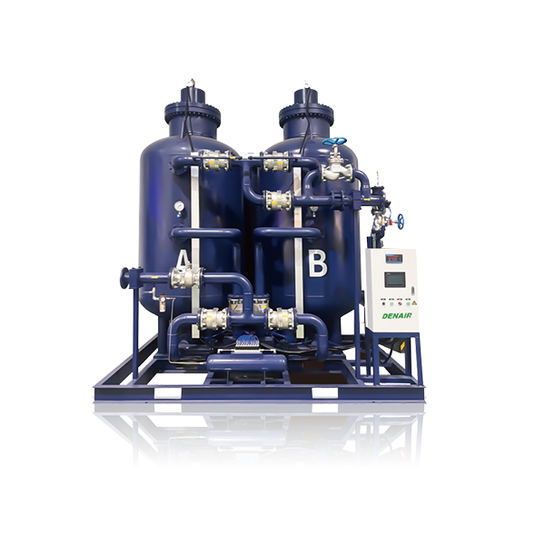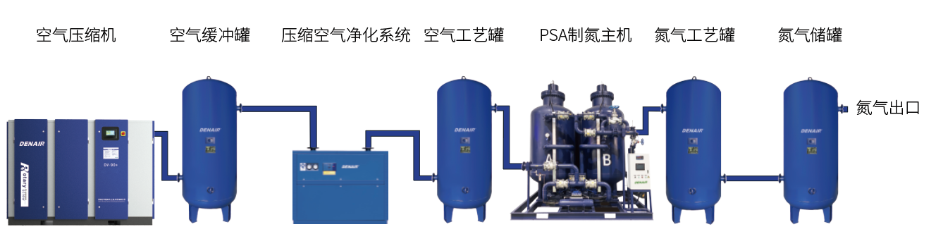 PSA制氮系統(tǒng)主要由以下八大功能模塊構(gòu)成:空壓機(jī)組→壓縮空氣儲(chǔ)氣罐(濕罐)→空氣凈化裝置→空氣干罐→制氮主機(jī)→氮?dú)夤に嚬?rarr;電氣控制系統(tǒng)→氮?dú)鈨?chǔ)罐。