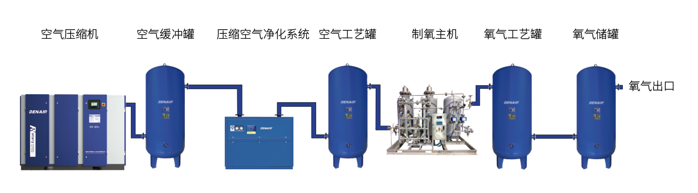 制氧系統(tǒng)主要由以下八大功能模塊構(gòu)成:空壓機(jī)組→壓縮空氣儲氣罐(濕罐)→空氣凈化裝置→空氣干罐→制氧主機(jī)→氧氣工藝罐→電氣控制系統(tǒng)→氧氣儲罐。